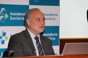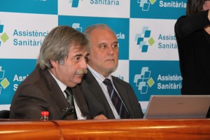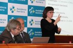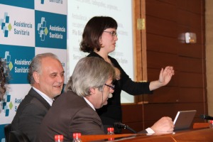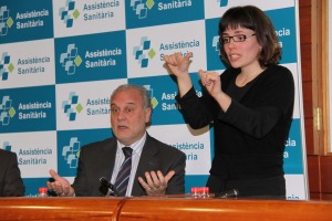 En la sala de actos del Hospital de Barcelona, el Sr. Xavier Solleone Ballesta, jefe del Departamento de Estadística y Clínicas A.S.C. de Assitencia Sanitaria, el Sr. Enric Sells, Secretario general del Consejo Rector de A.S.C., Elena Farreras Compte, Dirección y Gerencia de APSO (Atención a personas sordas y ciegas) e Isabel Sanmartín Olmo, Secretaria, administración de APSO realizaron una sesión informativa sobre el servicio de interpretes y concertación de visitas medicas para atender a los asegurados sordos para facilitar el acceso a la comunicación en los servicios médicos programados.