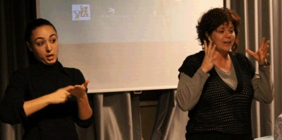 Susana Peix, una persona del Equipo Ginjoler que contando el cuento, junto con una intérprete Ingrid Noya en lengua de signos catalana.